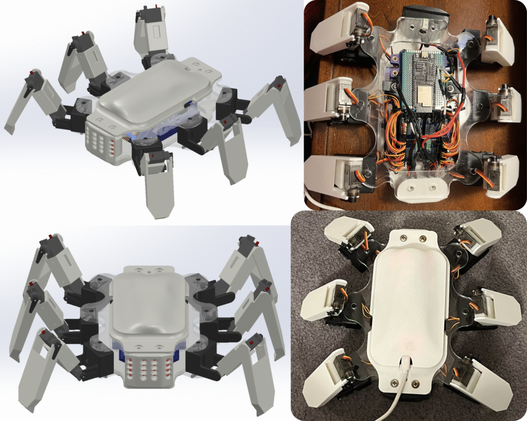 Hexapod is a six-legged walking robot whose purpose is to further my knowledge of the relationship of electronic components such as motors, microcontrollers, manufactured hardware, and computer programming. The current iteration of Hexapod features 18 servo motors, two motor controllers, one screw switch, and one ESP32 S2 Lily Go WOOR microcontroller. This has been my main independent design project, picking it up when time allows. The microcontroller needs replaced as the pins providing power to the servos is nonoperational. Once that is replaced, I will be able to use Arduino IDE to program this robot allowing me to further explore concepts such as Inverse Kinematics.