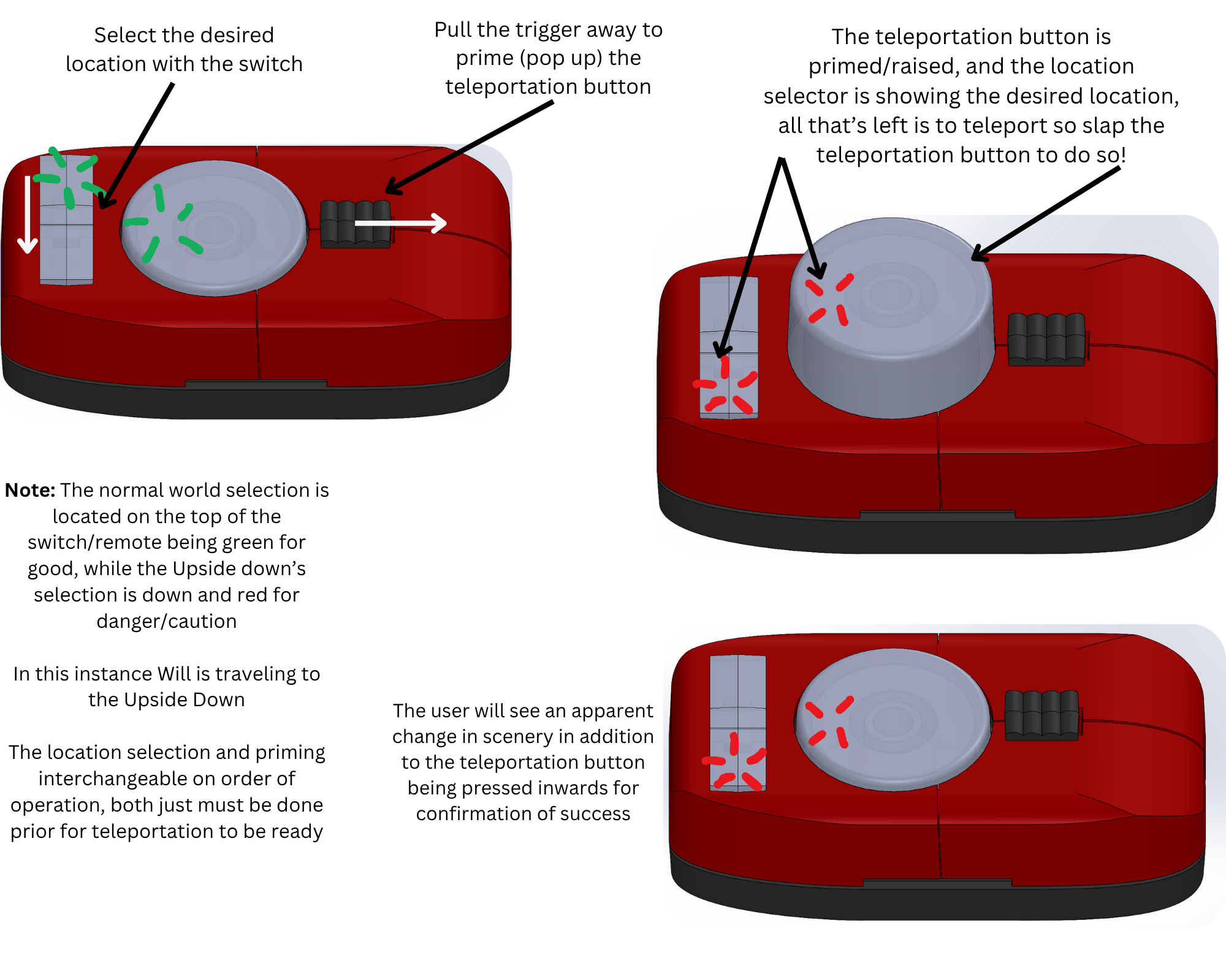 The behavior of the remote was designed to help Will build confidence and feel empowered. The simple opperation allows for the user to easily use the device. The large button “pops” up with a spring to help encourage Will to feel great when hitting it to teleport. The project called for a deep user analysis which can be seen in various aspects of trying to make a device similar to those of the time period, the size, and even the name. Blink Dogs are creatures in Dungeons and Dragons, a game that Will loves, which teleport to avoid danger, just as this device enables Will to accomplish.
